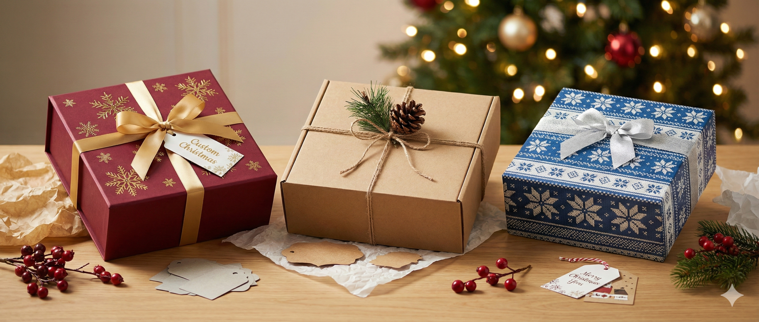 Let’s say you’re leaning into a winter wonderland theme. Think soft blues, whites, maybe some silver foil. Snowy patterns. Clean textures. For a cozy nights theme, you’d want deeper colors like burgundy, pine, and rich cream paired with kraft paper, maybe some string or soft-touch finishes. Festive celebration boxes could go wild with reds, greens, golds, and glossy finishes that shine under twinkle lights.